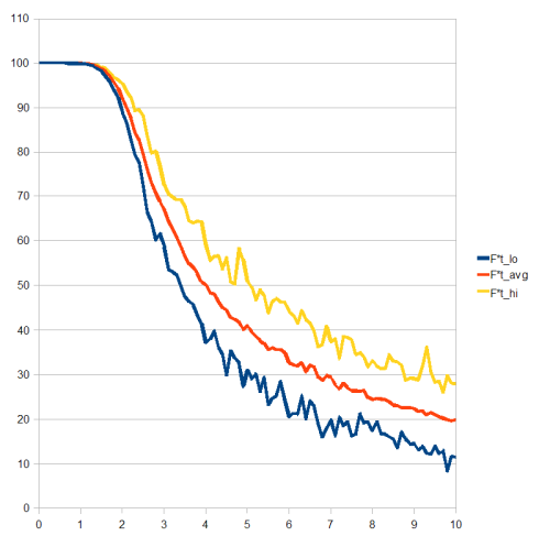 The peculiarities of the model and the sampling combine to give this curve its shape, so don't take it as a general case. By using a simple bell shaped impulse for each collision, the location of the dropoff after critical separation is initially shallow, then very steep but becoming increasingly shallow again. Had a step function been used instead, the lines (except for the introduced randomness) would be straight. Not very interesting, neither very realistic. Debris oddsorts, excluding columns and braces of significant size, might well be expected to be compressible up to a point, and a simple sigmoid-type time derivative seemed appropriate for brief impulses from either elastic or inelastic collision.