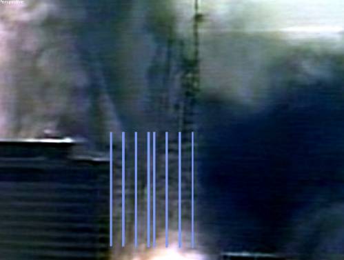 When viewing these clips one should remember that much of the core, including the entire east-west width of the northern 500 and 600 CC rows survive the initial collapse with cross bracing intact. This means that the core, just 37 ft within the west wall and 60 ft within the north wall, remains intact while the collapse front progress to the ground.