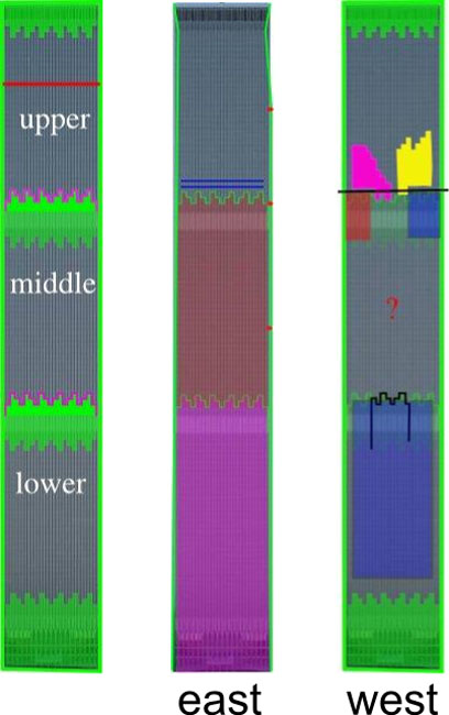 Columns 504, tall and leaning, and column 501 can serve as easily identifiable landmarks in most all video and photos of the core remnant. We know that columns 501 to 504 mark the boundaries of the the west half of the core. We also know that all columns east of 504 must be from the east side of the core. In the image the east and west sides of the core are distinguishable just by locating columns 501 and 504
