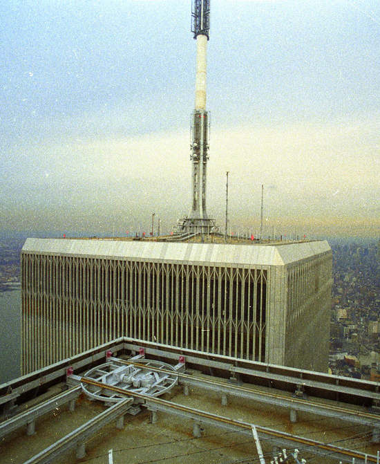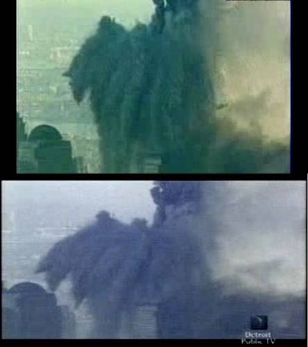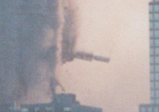 WTC1 Antenna: Large piece slides of the building and falls southward