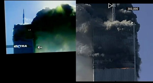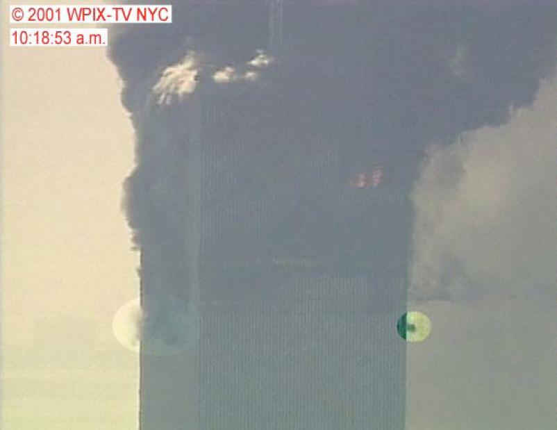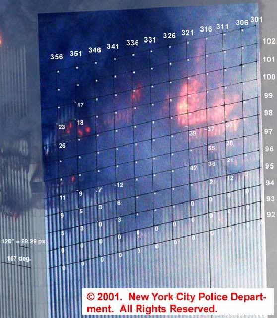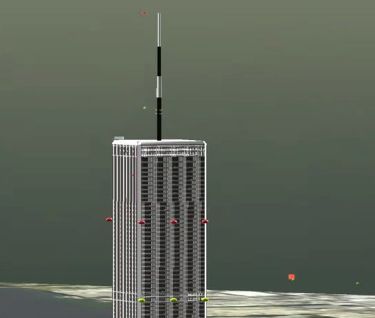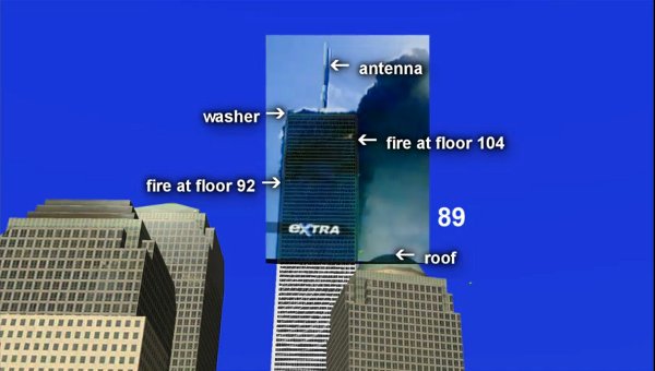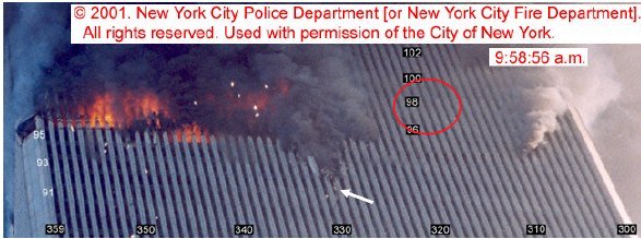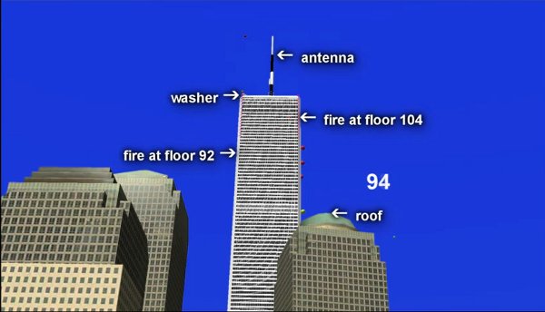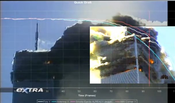 NBC viewpoint: antenna drop compared to SW corner fire drop and 95th and 98th floor ejections