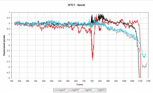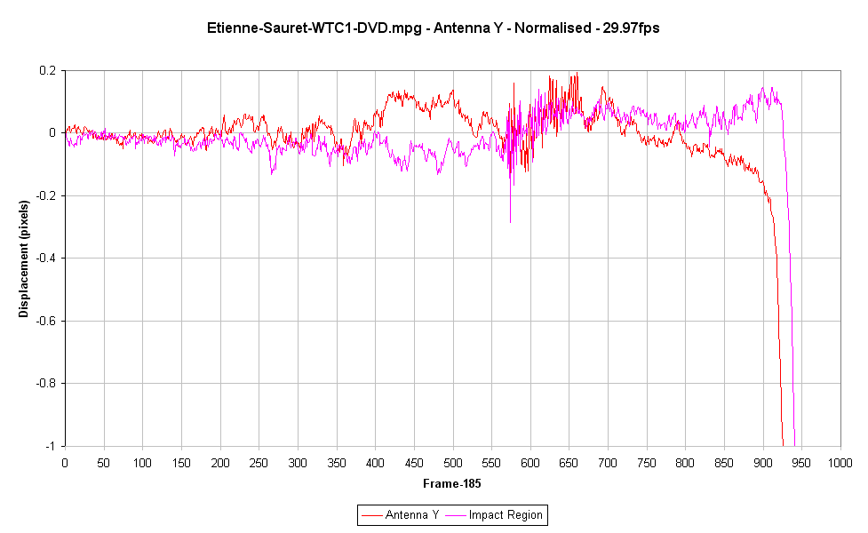 The Sauret video is shown below. At 9.5 seconds before visible collapse the camera noticeably shakes. This is when the slight movement of the antenna and northwest corner begin to be detected.
