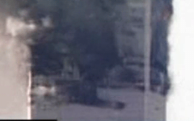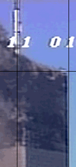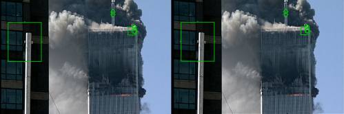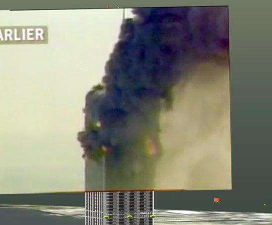 Looking from the Sauret viewpoint at the whole building above floor 92, flashing between frames 120 and 220 (just over 1.5 sec interval). Remember that the NW corner starts to accelerate downwards around frame 224. This simple visual tool allows you to verify that the tendencies documented in the drop and drift curves shown to you represent very real movement that grows into visible deformations. Movement from as early as Sauret frame 140 is visible to the naked eye: