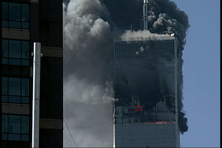 The area marked in red will be pulled inward about 55 inches in the next 24 minutes. Not only is there no sign of the inward bending at 9:58, but there are no visible fires in this location at this time.