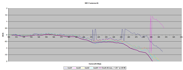 Between frame 165 and 217, the rate of antenna tilting quickened and reached about 0.75�. After frame 217, the rate of tilting of the antenna stopped for the next 40 frames. During that time the antenna merely shifted southward while the north face (upper floors) seem to have tilted a bit more.