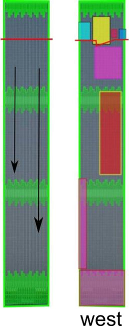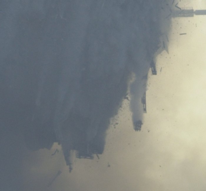 West Wall Motion visual recostruction verifies the upper portion fell out and over the lower portion. The upper portion is the large falling object seen in this image: