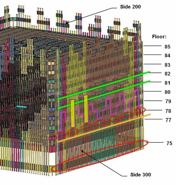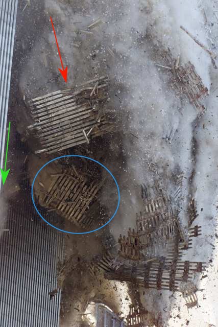 Just after the 75th floor east face row of ejections became visible in image 4 above, large sheets of flooring constructed of beams were ejected from the west side of the building with MER perimeter columns still attached. The location of one of the interconnected sections of MER perimeter columns with beam flooring is shown as a yellow and red plane in the graphic below: