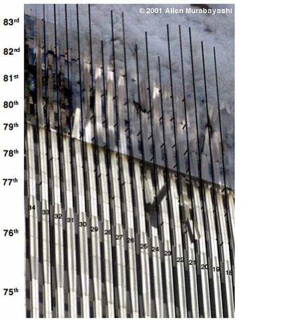 The upper section breaks the final connections coupling it to the lower section just before the distinct row of 75th floor ejections emerges. It then falls downward behind the lower east wall, thrusting the intact lower wall out as a result as seen.