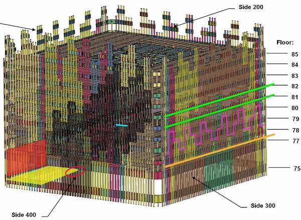 7) 75th fl west wall north and south quarter of MER panels ejected from building with flooring still attached. NW and SW MER corners are destroyed, west wall upper portion falls out and over lower portion.
