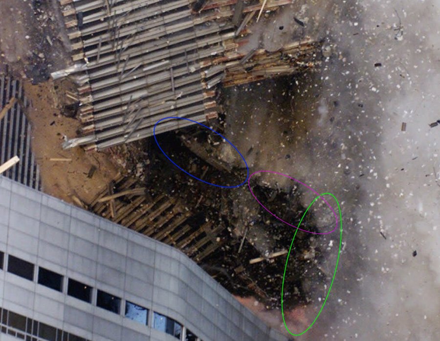 Image 4 also marks the moment just before the west beam flooring from the mechanical equipment room (MER) levels will be propelled westward out of the building and the MER corner pieces will be ripped outward. The process is mapped in the next item.