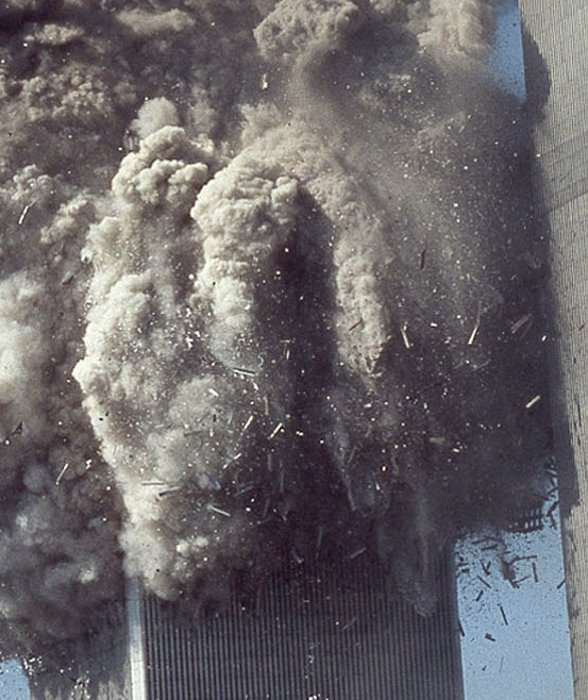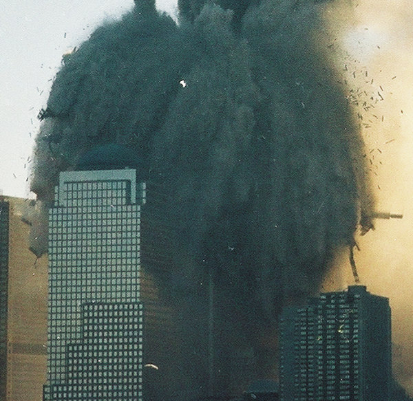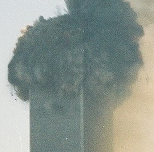 From this image one can already verify that the upper north wall fell out and over the lower portion because the streaks obscure the floor-by-floor ejection pattern through the window grills. The same logic shows the south wall acted the same way.