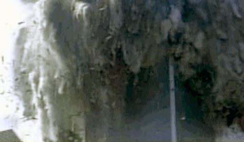 Once again, please notice how the particulate flow takes the form of the rows of cotton balls formed by the window grillage on the left, and the particulate flow appears as long falling streaks on the right.