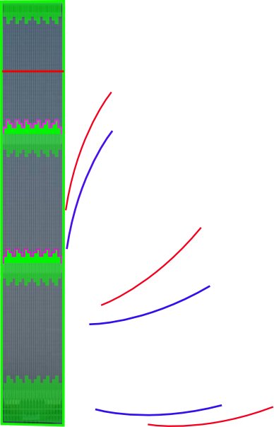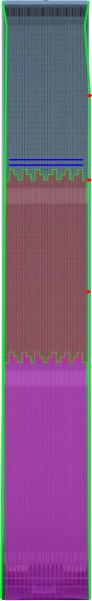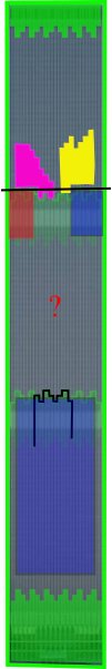 In the last case, this is the model for WTC2 west where the right and left quarters of the 74-78 MER belt shown in red and blue are forcefully ejected from the building with beam flooring still attached. This destroys the green MER belt, resulting in fragmentation of the wall down to the upper edge of the 40-44 fl MER belt. The lower wall survives the collapse of the building temporarily erect and then the lower blue section up to the 44th fl falls outward as a unit.