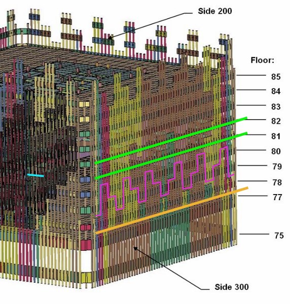 I can describe each of the 8 sides of the twin towers independently using this model. The green seams are important. They are the lowest bolted seam above the 2 central MER levels. They play an important roll in the overall perimeter motion.
