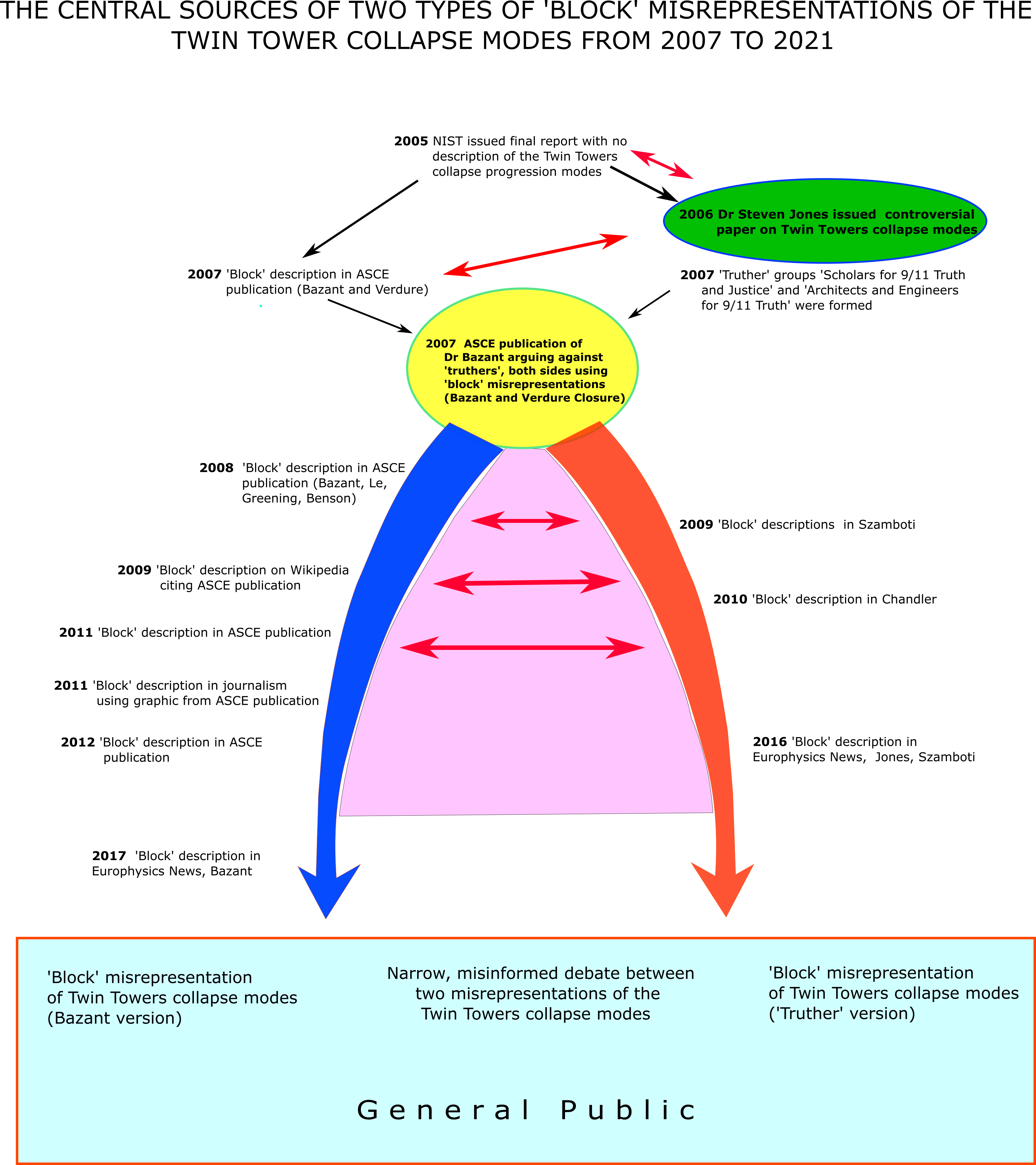 Debates in the pink region are between 'block' misrepresentations (Bazant variety) vs 'block' misrepresentations ('truther' variety) of the Twin Towers collapse processes